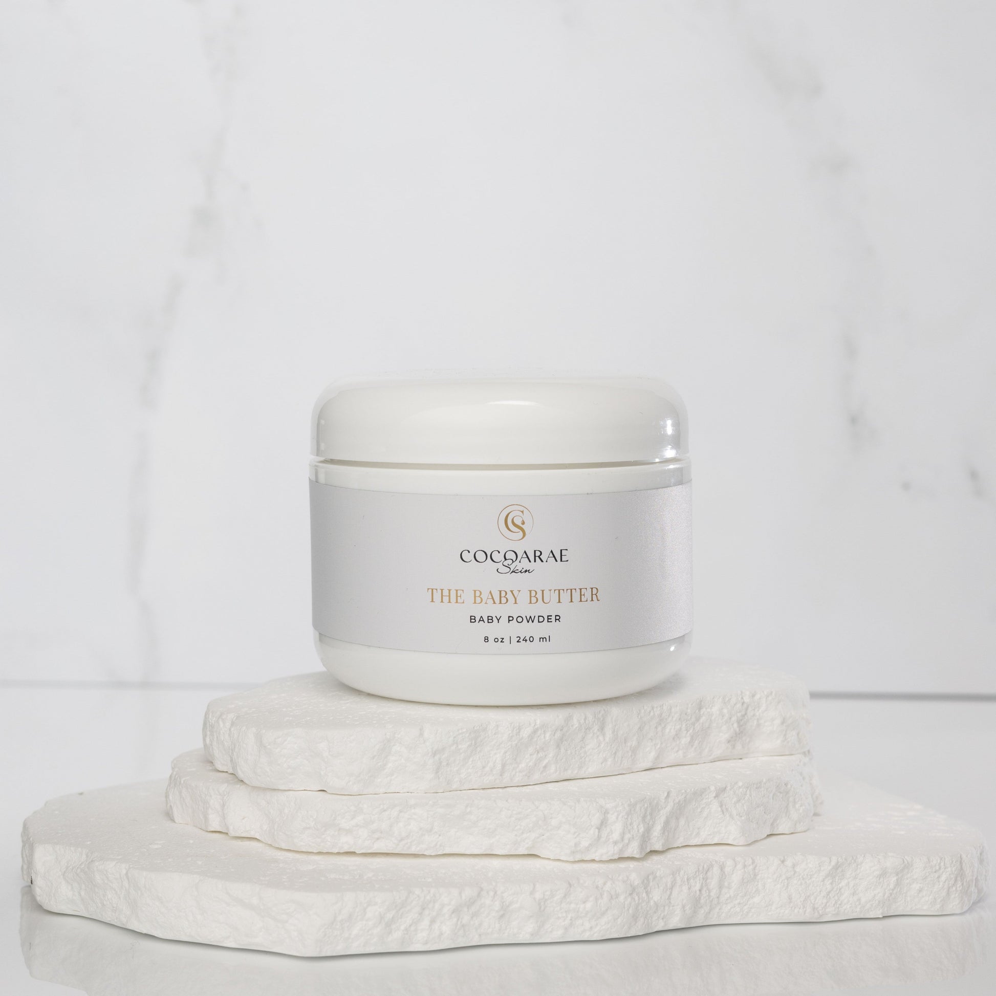 The Baby Butter is a soft, nourishing blend of shea butter, cocoa butter, and coconut oil, and vitamin E. Crafted to gently moisturize delicate skin. Free of essential oils and lightly scented with a natural baby powder fragrance. It is perfect for newborns and little ones. Smooth, simple, and soothing! Just the way baby skin care should be!