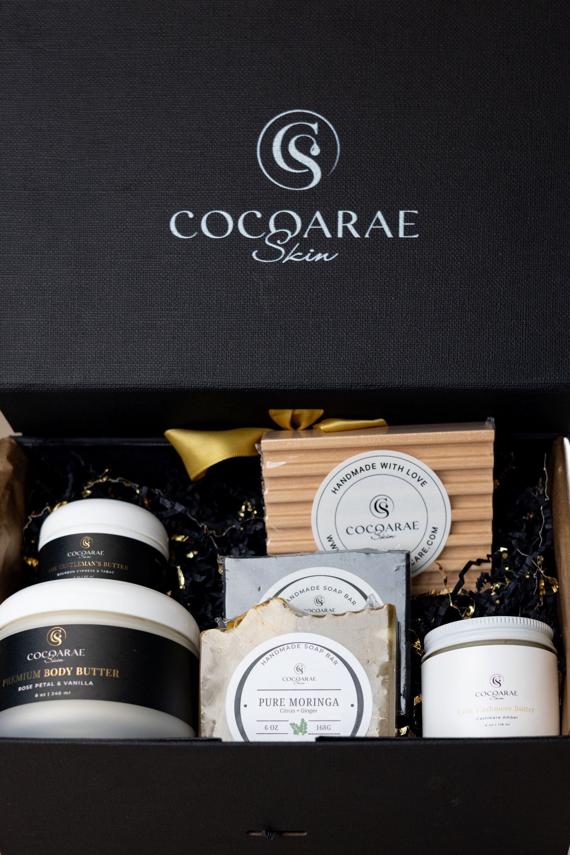 Indulge in the ultimate Cocoarae Skin experience with our Luxe Gift Set, a beautifully curated collection designed to pamper, nourish, and glow all season long. Each set includes your choice of a full-size 8 oz Body Butter, a travel-size Body Butter for on-the-go hydration, and two handcrafted soap bars made with skin-loving natural ingredients.